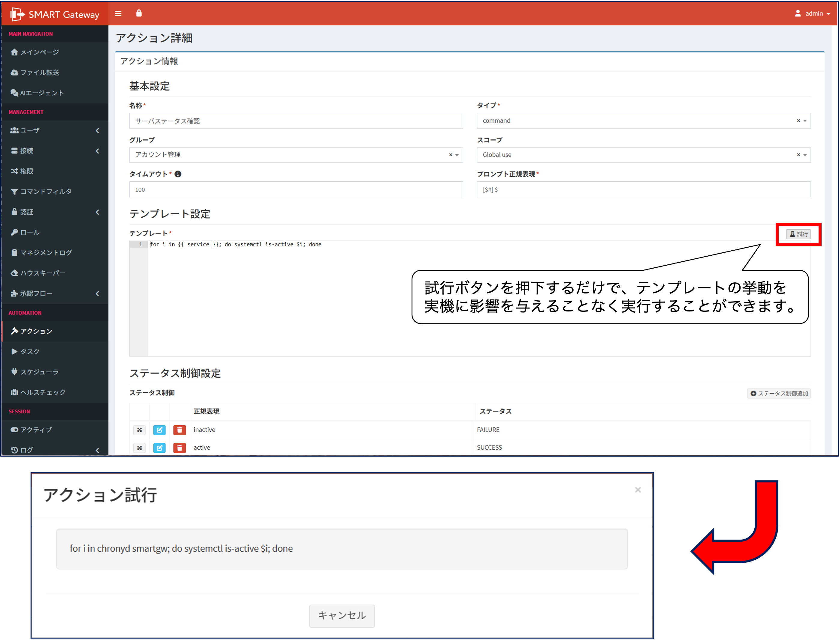 例えば複雑なテンプレートを、意図通りの挙動になるよう修正を行いながら作成する際に便利です。また、アクションの挙動を実機に実行する前に確認できるため、実機に対し意図しない環境変更を実行してしまう心配がありません。テンプレート設定作業の効率化や、アクションを用いたオペレーション自動化の品質向上を期待することができます。