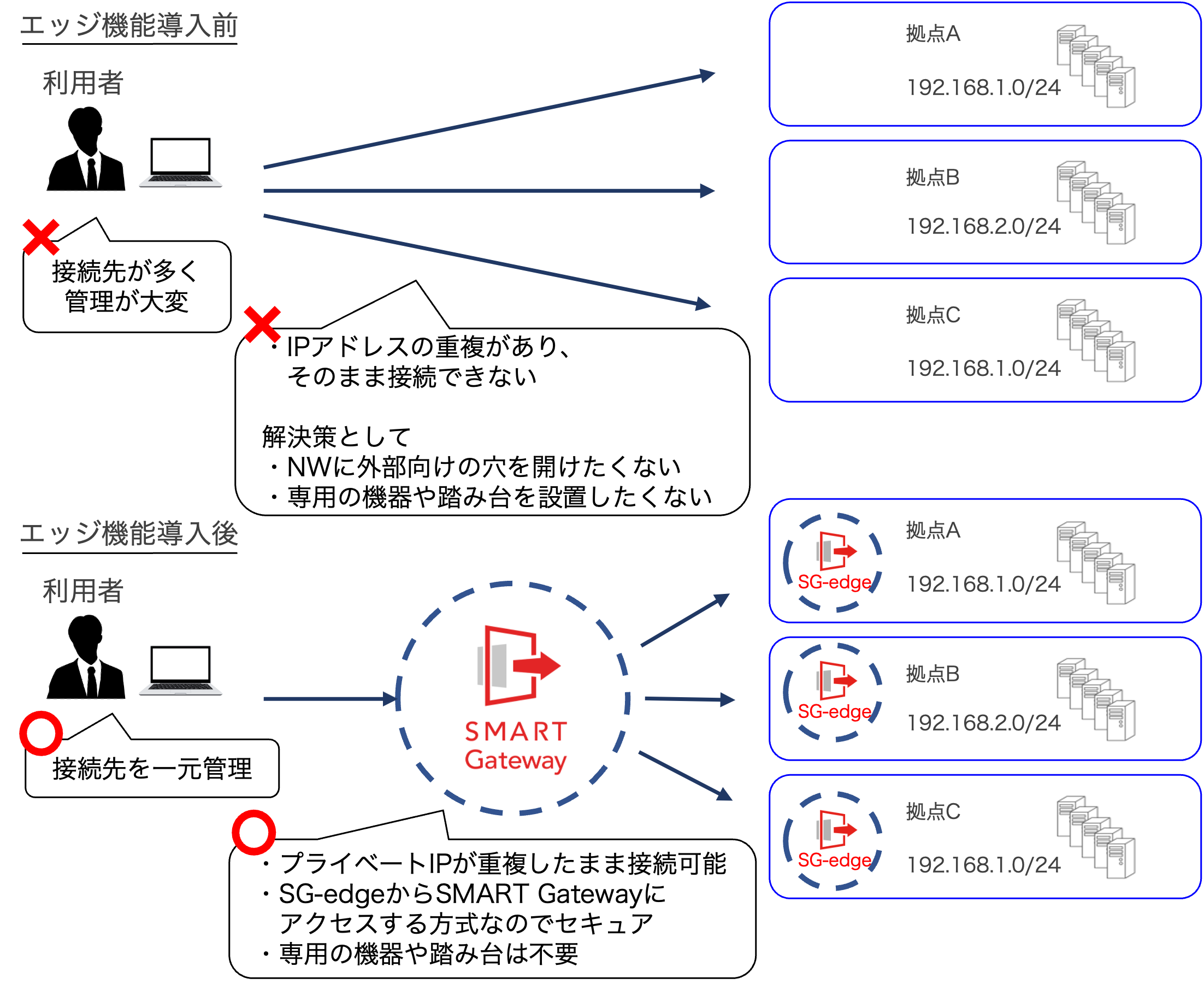 今回追加したエッジ機能では、ネットワーク分離している各環境にSMART Gatewayのエッジサーバを配置することで、環境同士のプライベートIPの重複を解消する必要がなくなり、管理NW向けの通信の開放も不要となります。