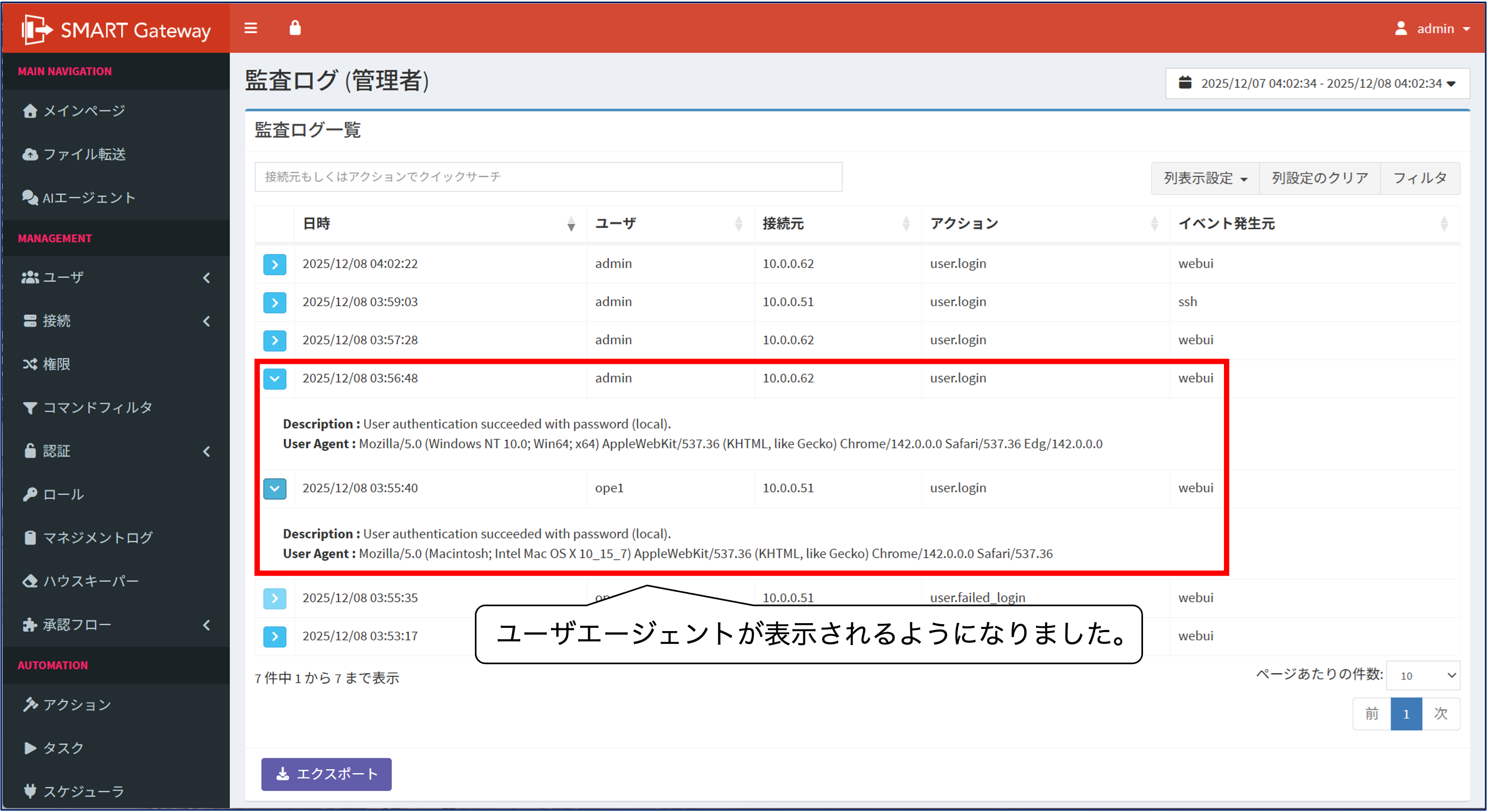 SMART Gatewayの利用者がWebUIにログインする際、利用者の環境を示すユーザエージェント情報を監査ログに出力するように改善いたしました。