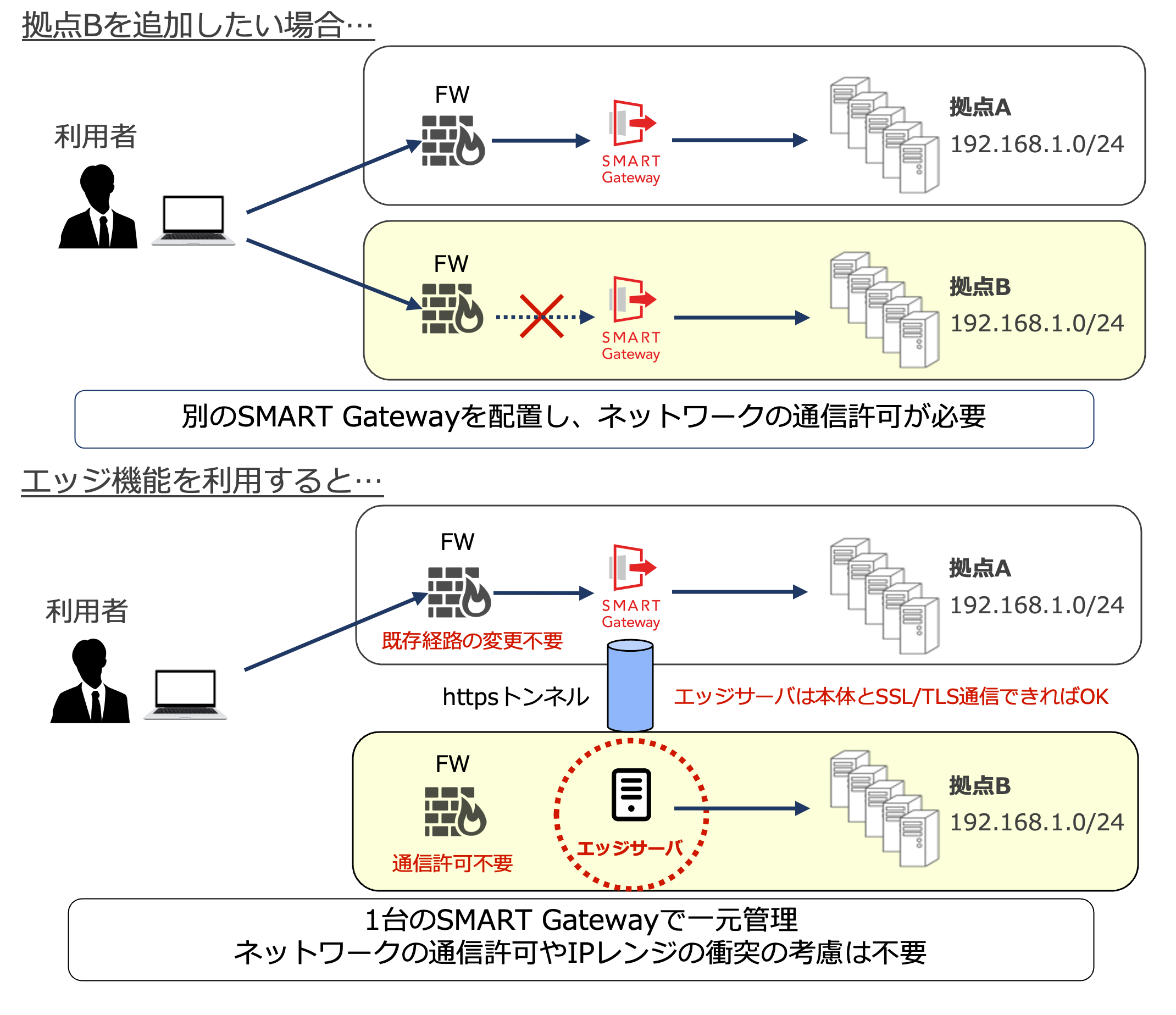 また、SMART Gatewayサーバとエッジサーバとの間にhttpsトンネルを形成するため、SMART Gatewayまでの通信経路に対する設定変更は不要です。さらに、エッジサーバからSMART Gateway本体へSSL/TLS通信さえ可能であれば、追加したい機器が属する新規のネットワークセグメントに対する通信許可も不要です。