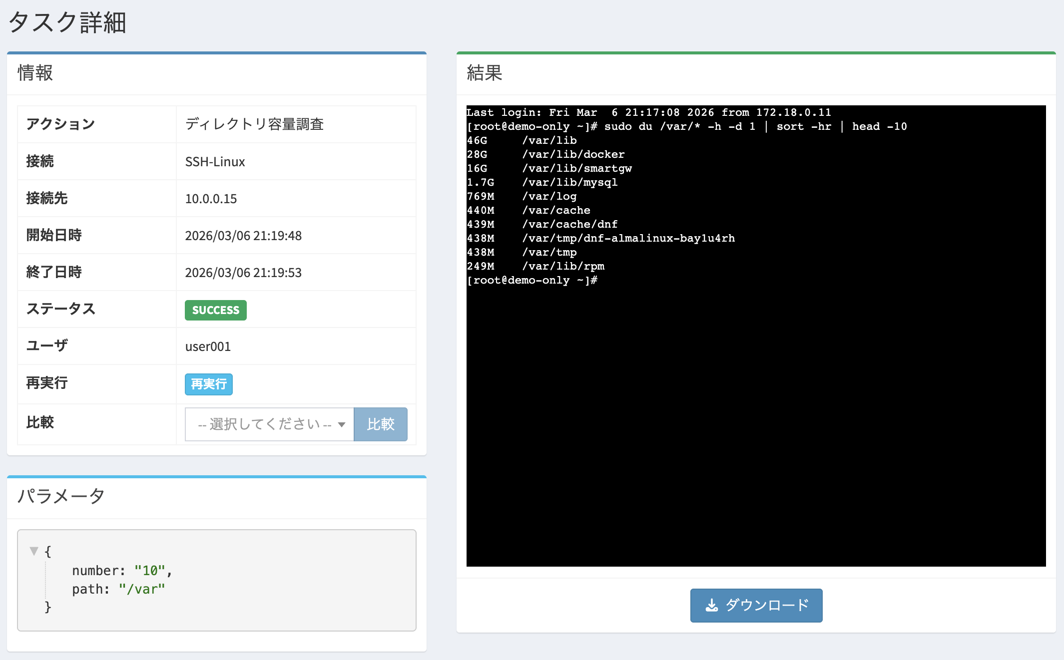 定型的な作業の効率化や、特定の作業のみ許可したい作業者に対し接続権限ではなく特定操作の実行権限のみ付与するなど、様々な用途にお使いいただけます。