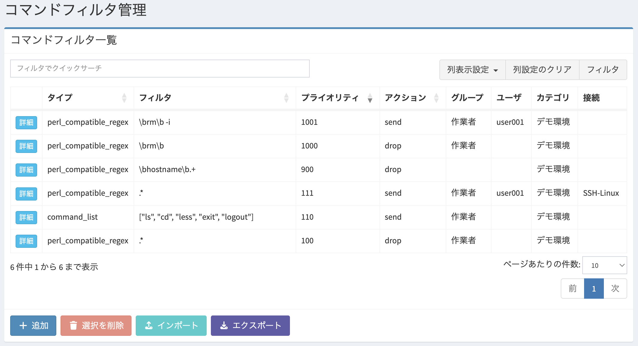 正規表現で指定したコマンドについて、設定した優先度に基づいて機器への送信・破棄を制御します。